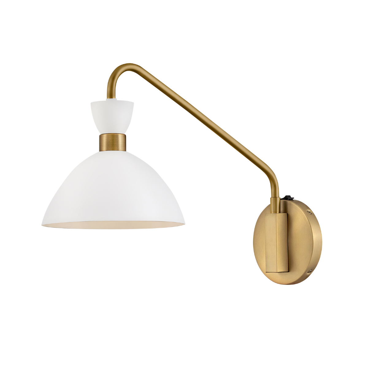 The Simon sconce makes our hearts beat a little faster thanks to its retro mix of mid-century modern style, adjustable metal shade and a rich Matte White finish that pops against the luxe Heritage Brass backplate and accent detailing.