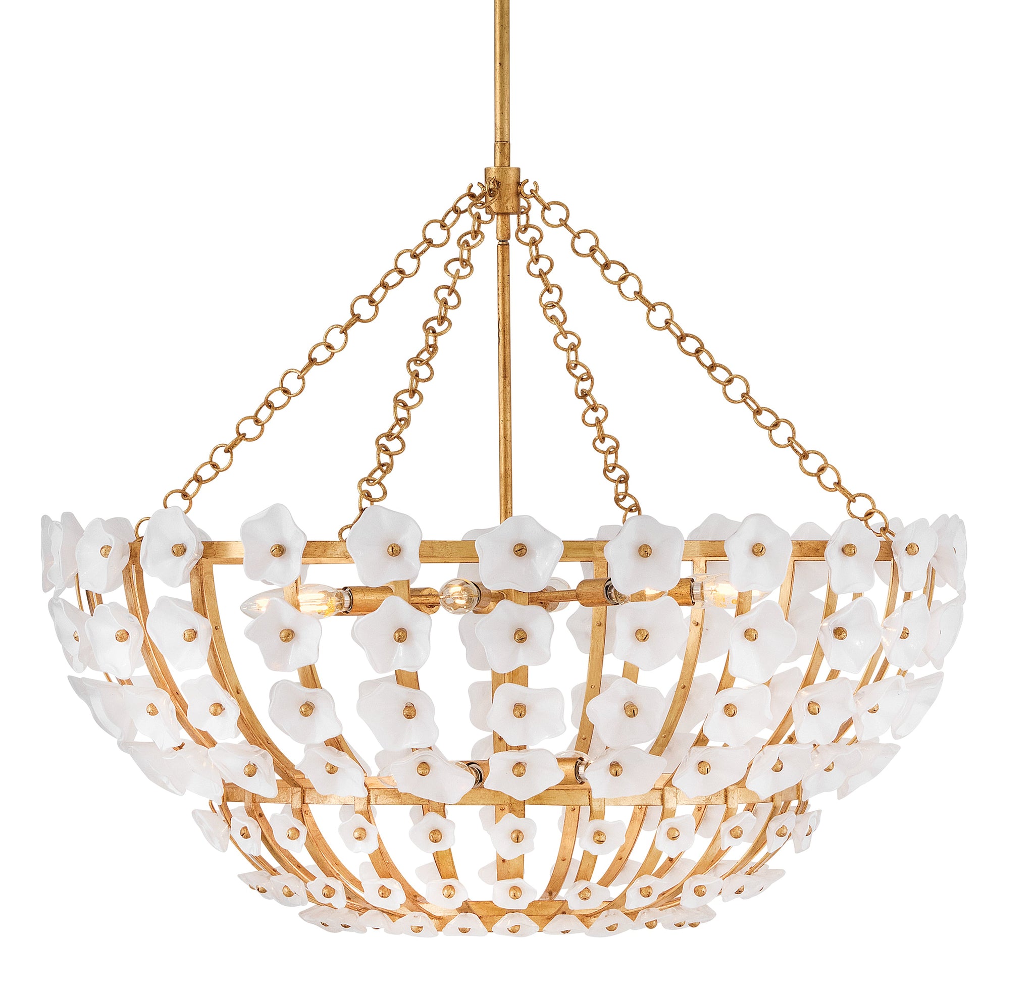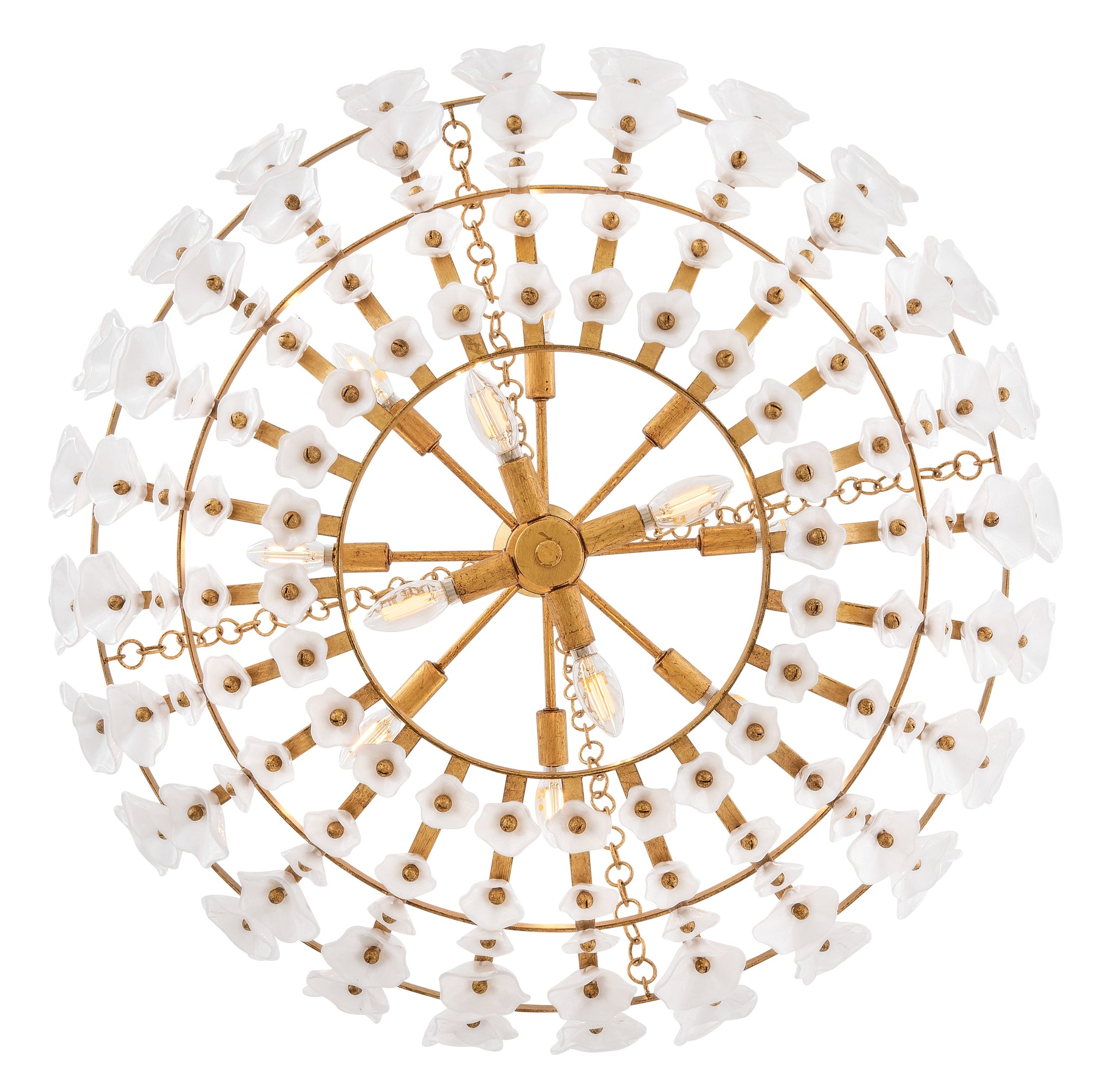 Inspired by the natural romance of annual spring blooms, Azalea’s intricate silhouette is adorned with double-layered glass blossoms crafted from clear and white glass. A Distressed brass frame complements an abundance of warm, ambient illumination from dimmable candelabra lamps.