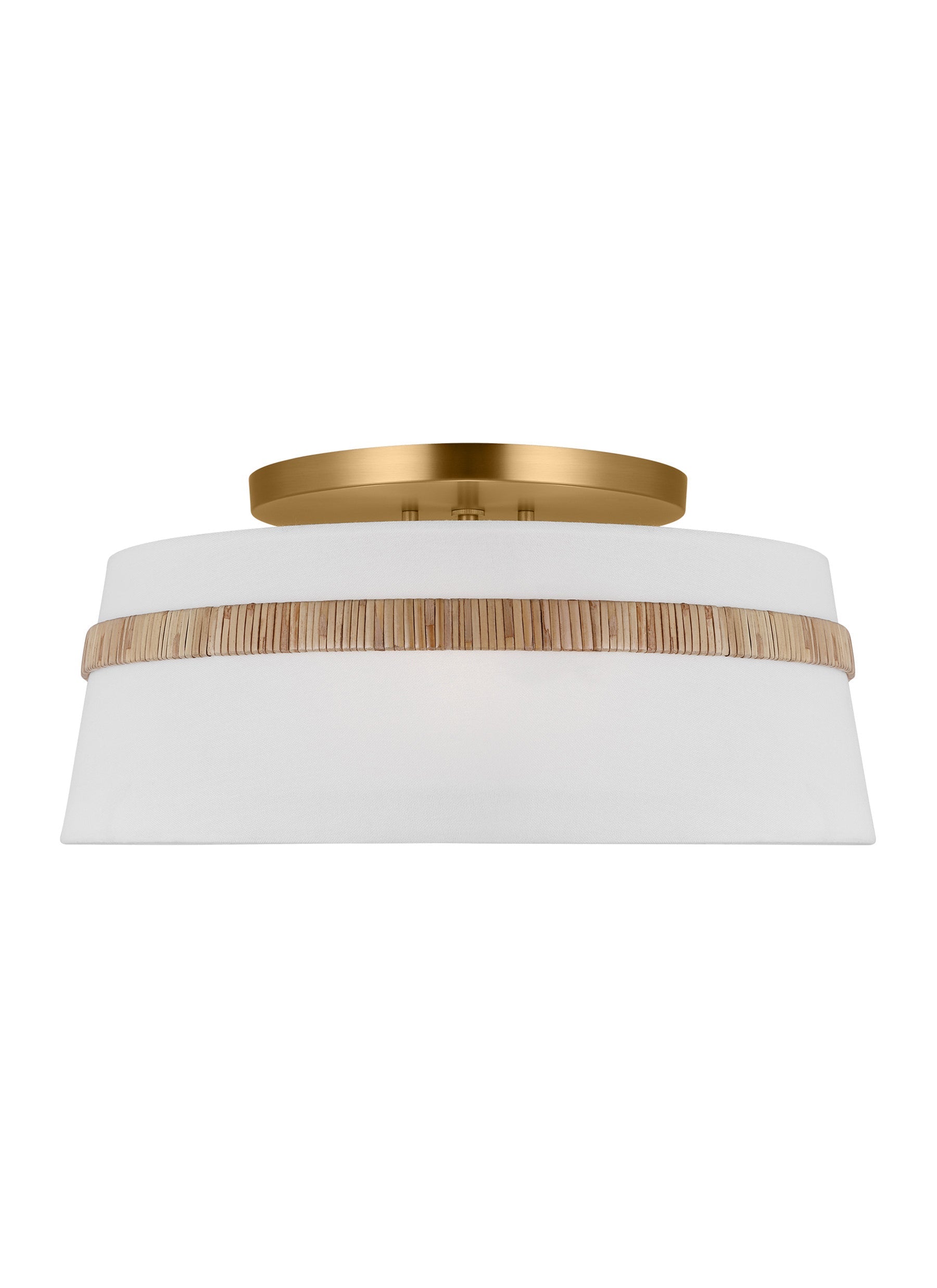 The simple, transitional Cordtlandt semi-flush mount ceiling fixture by Alexa Hampton features a perfectly proportioned conical hanging shade with an optional metal band cinching it at the waist. Available in an Aged Iron, Burnished Brass or Polished Nickel finish. Also available in a Burnished Brass finish with Rattan accents. The classic Hamptons mid-century Hamptons design fits most rooms of the house.