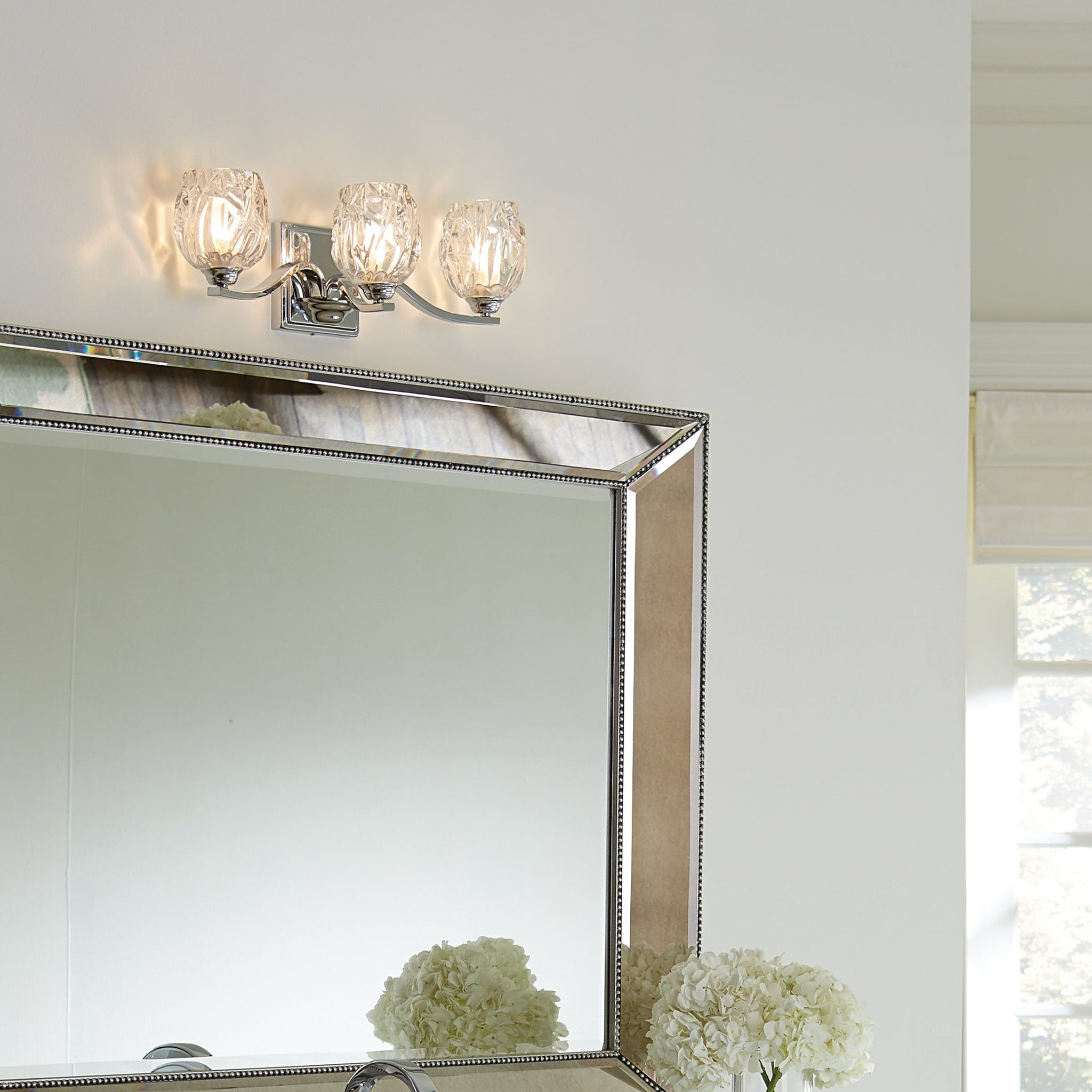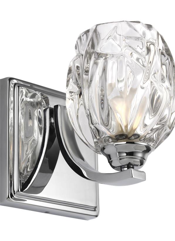 The glamorous Kali bath lighting collection by Feiss emits soft light sparkling through thick, multi-faceted, clear pressed votive crystal glass shades which rest on softly flourishing arms. The elegant and feminine aesthetic is grounded with a tailored backplate to add an extra design detail, ensuring the transitional approach complements a wide array of décor.