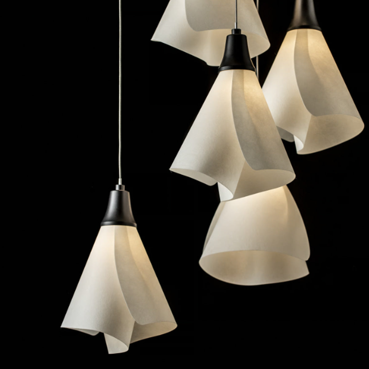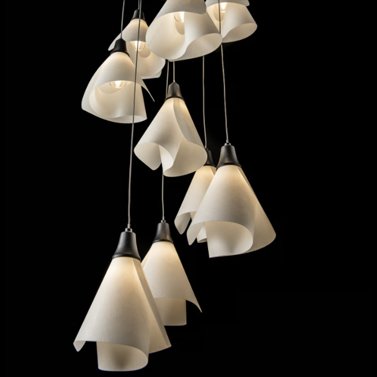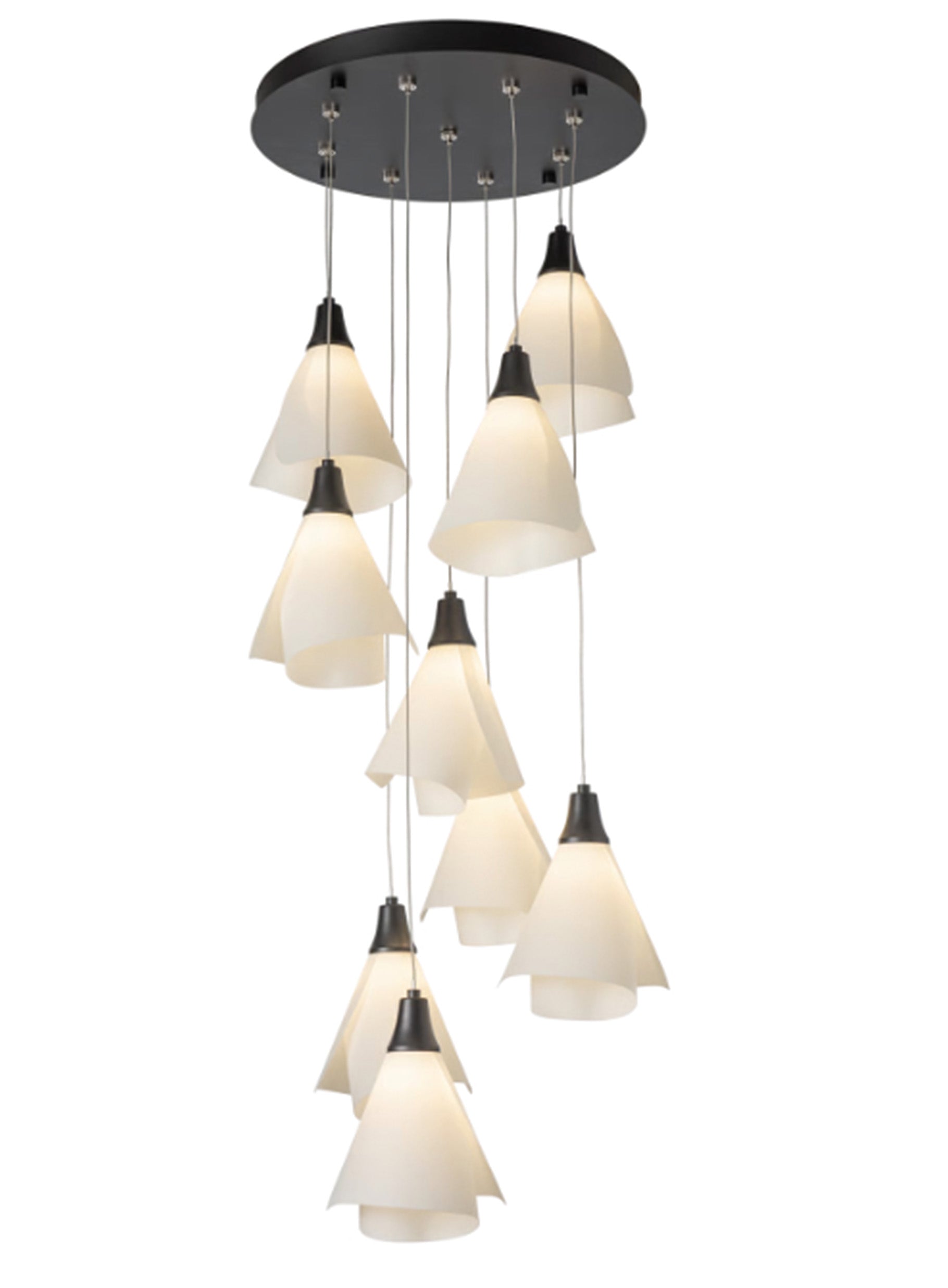 Spun Frost shades create an ethereal feel with the Mobius 9-Light multi-port fixture. Its round canopy creates a central cluster, and the customizability of the cable lengths offers the ability to stagger each pendant to enhance the space. The Mobius Collection includes a range of sizes and formats appropriate for any interior setting.