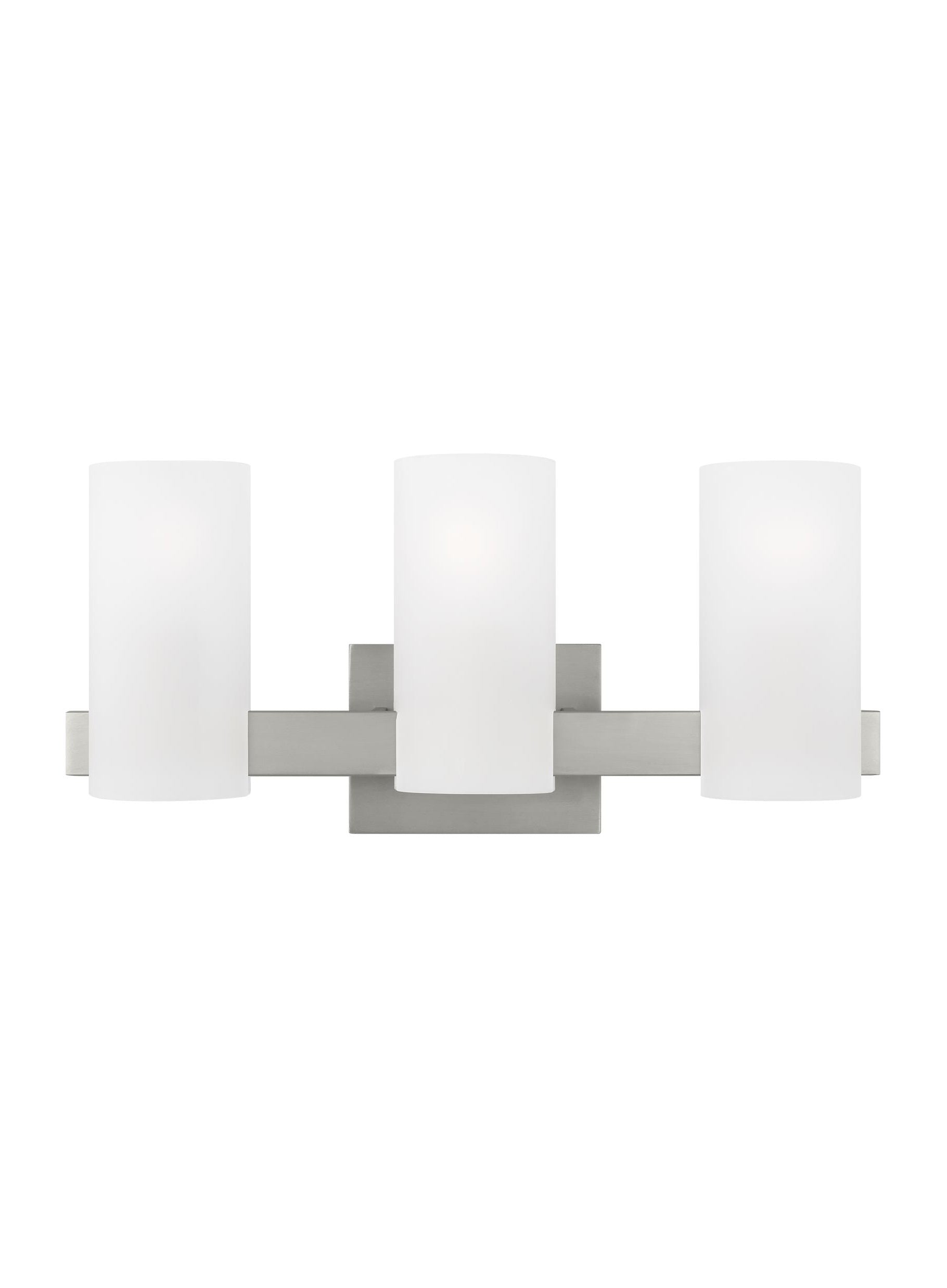 Perfect for the bathroom, this modern design by the Scott brothers, takes a minimal bar and straddles etched white glass shades for a unique design. The look works in a modern apartment or a classic farmhouse looking for a bit of mid-century vibe.
