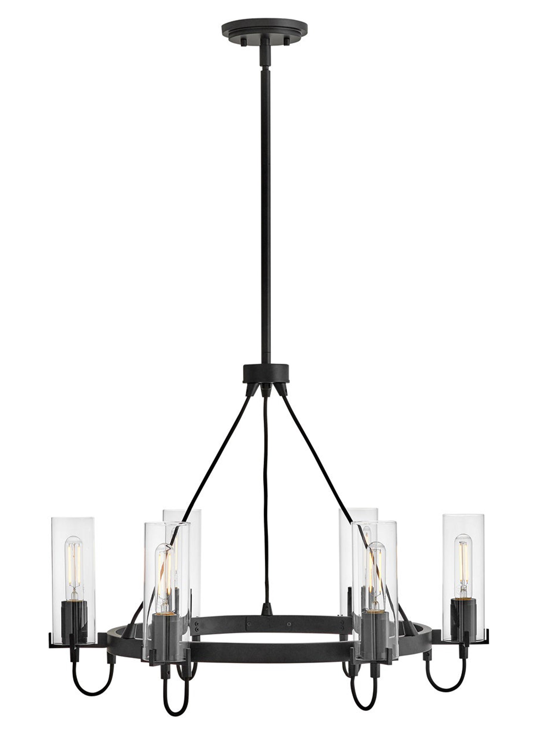 A versatile stunner, Ryden's elongated, clear glass shades envelop its bulbs, held by heavy cast prongs and ribbed details. Black, fabric-wrapped cords perfectly complement Heritage Brass, Black, and Brushed Nickel finishes.