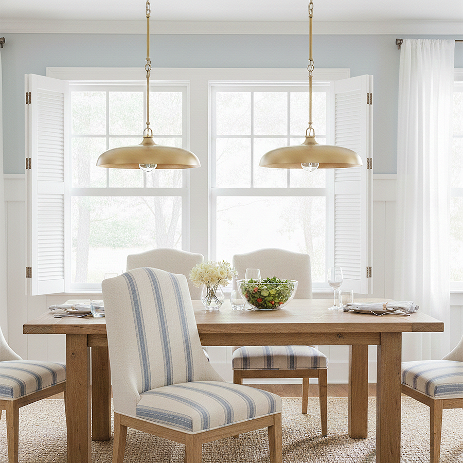 A sophisticated, transitional accent piece, Sadie features a large yet shallow, saucer-style shade with contrasting interiors. Classic two-tone finishes and decorative chain-linked stems enhance bright yet inviting illumination.